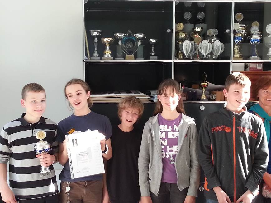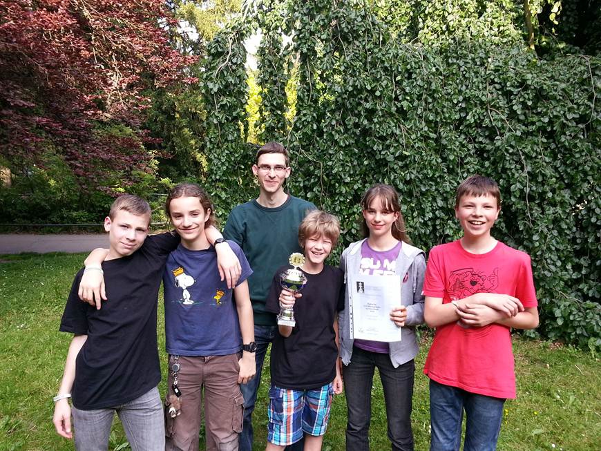 Ganz zum Schluss wartete mit Ettlingen noch einmal ein unangenehmer Gegner. Mit einem 1600er am ersten Brett hatte David schwer zu kämpfen. Er schaffte es sogar ein gutes Endspiel zu bekommen, das er wegen der ungleichfarbigen Läufer nicht gewinnen konnte. Robert übertrieb es im Endspiel ein wenig, da die Anderen nicht so gut standen, und musste am Ende seinem Gegner gratulieren. Julian gewann die Dame und bald darauf die Partie. Cora hatte bis dahin super-solide gespielt. Durch einen taktischen Trick verlor sie jedoch die Dame für einen Bauern! Der Kampf schien aussichtslos bis der Gegner bei einer Abwicklung die Dame gegen einen Turm tauschen wollte und anschließend noch seinen Turm vergaß. Im Turmendspiel hatte Cora sogar einen Bauer mehr und konnte schließlich den Sieg einfahren.