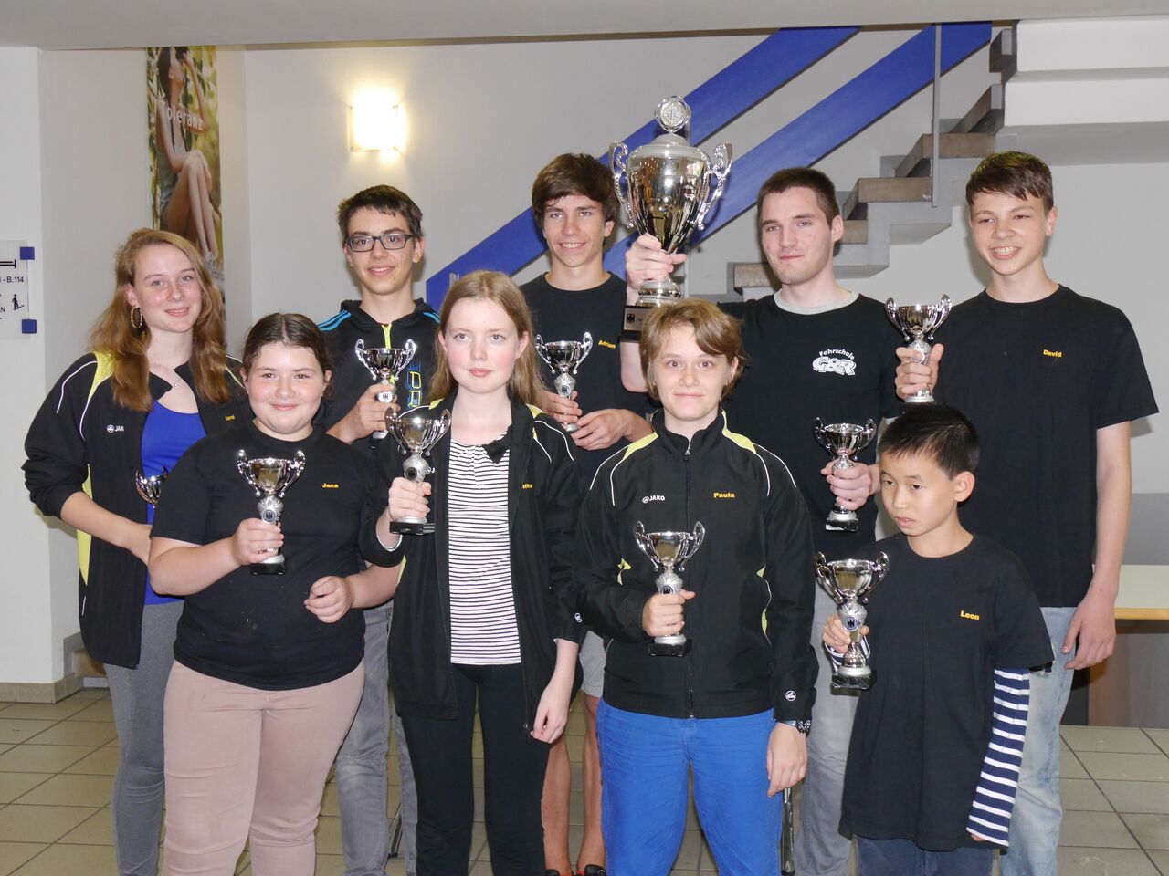 Die Auswahlmannschaft der Badischen Schachjugend bei der Siegerehrung mit dem Pokal für den 2.Platz. Hinten in der Mitte Adrian, rechts David.
