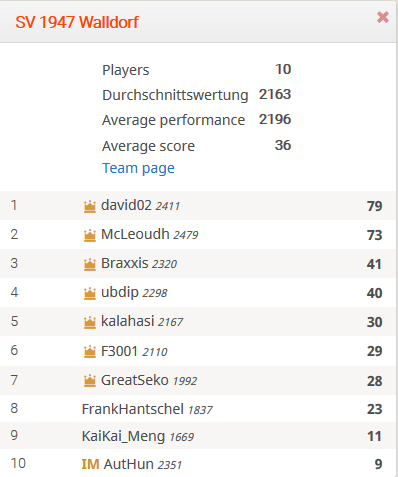 Richard,ohne Fabians Punkte, der nicht in die Wertung kam, da er zu spät einstieg und 7 aus 8 holte, und auch nur mit 21 Partien (11 Partien)