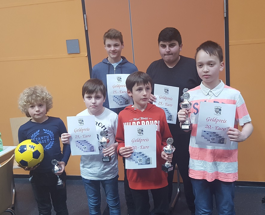 Conrad, Pablo, Lukas und Tom (kl) siegten, Robert fügte ein Remis bei. Im nächsten Jahr geht es in der B-Kasse weiter, eine neue